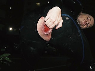 Man in latex getting a big black dildo
